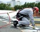Właściwe stosowanie indywidualnych środków ochrony przed upadkiem z wysokości podczas pracy na dachu płaskim, takich jak szelki bezpieczeństwa, linki bezpieczeństwa z amort...